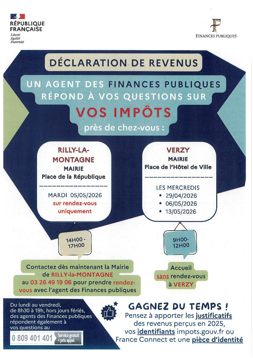 Un agent des Finances publiques 💰assurera des permanences en mairie de Rilly-la-Montagne et Verzy afin de répondre aux questions des usagers du secteur.