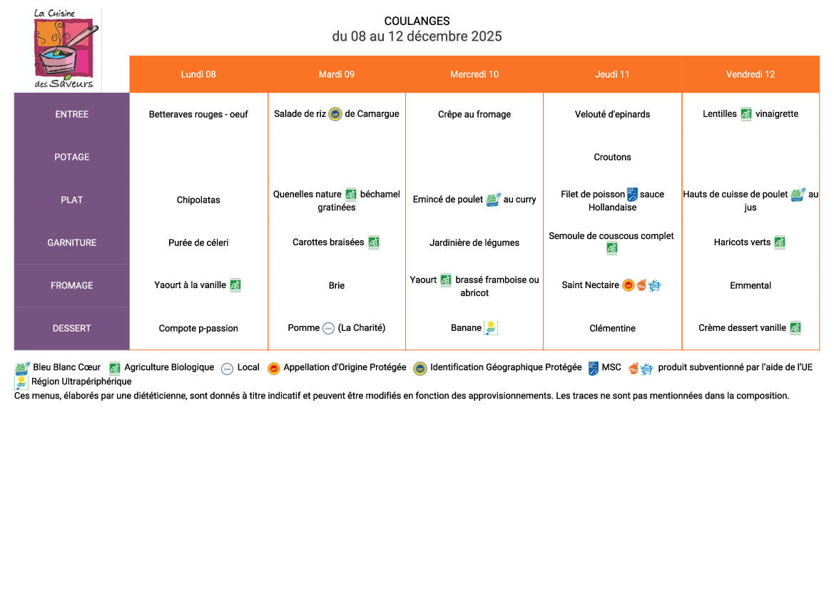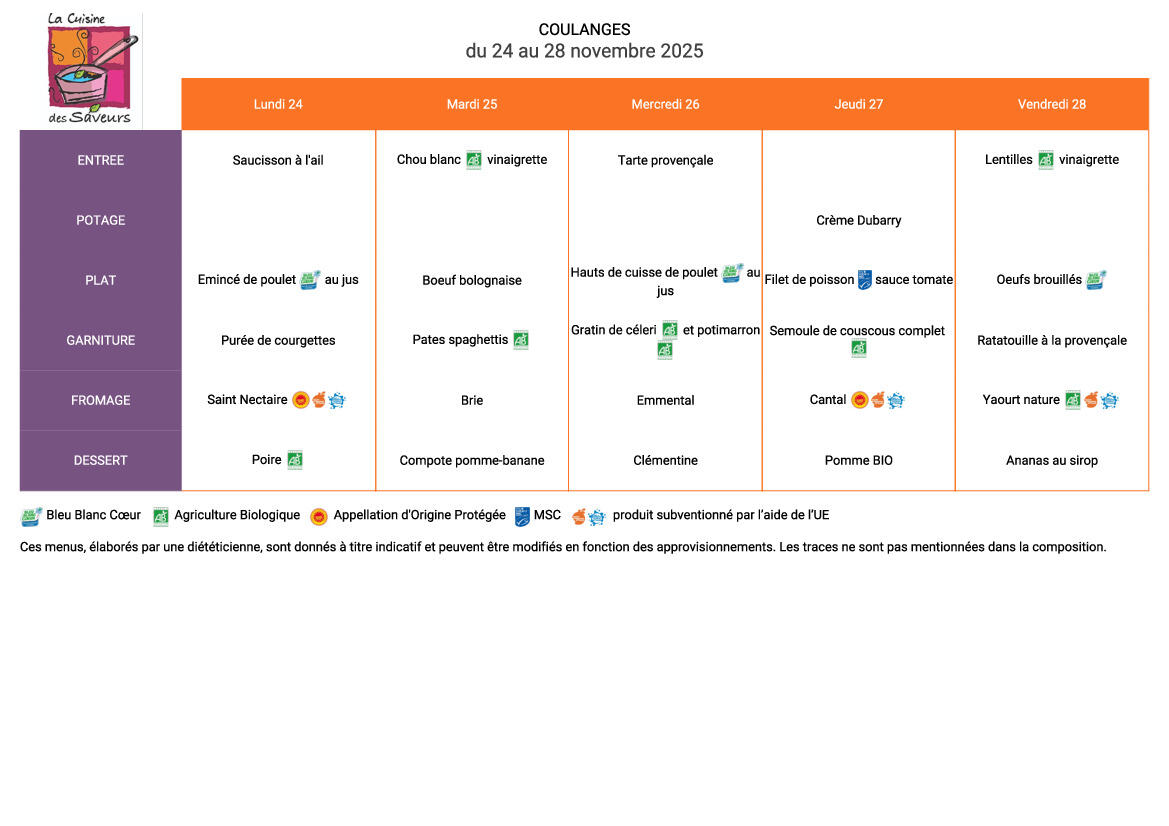 Menu scolaire du 24 novembre au 5 décembre 2025