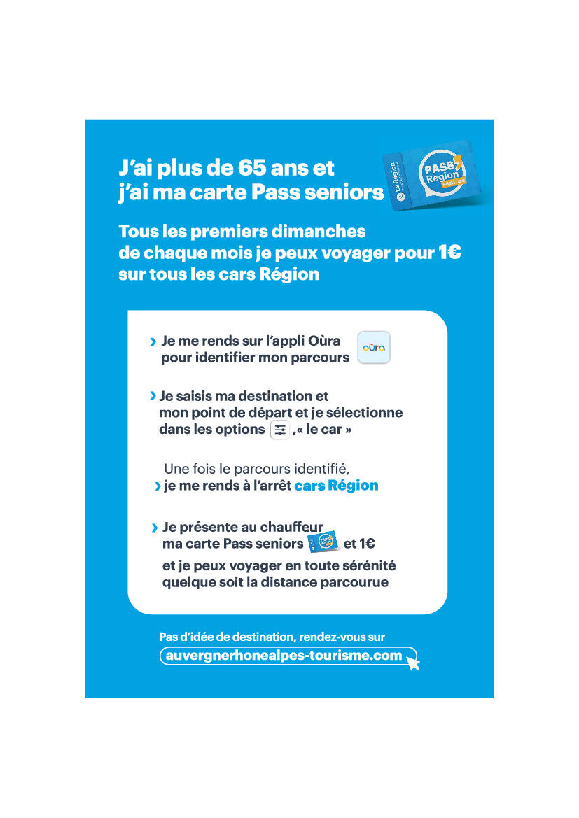 À partir du 1er février, tous les cars Région (hors lignes touristiques) accepteront la carte Pass Senior, disponible gratuitement auprès de la Région Auvergne-Rhône-Alpes. Destinée aux personnes de plus de 65 ans, cette carte propose des réductions chez de nombreux partenaires et permettra également de voyager à bord des cars Région pour 1 euro le trajet, chaque premier dimanche du mois. Une opportunité de se déplacer à moindre coût, quelle que soit la distance parcourue.