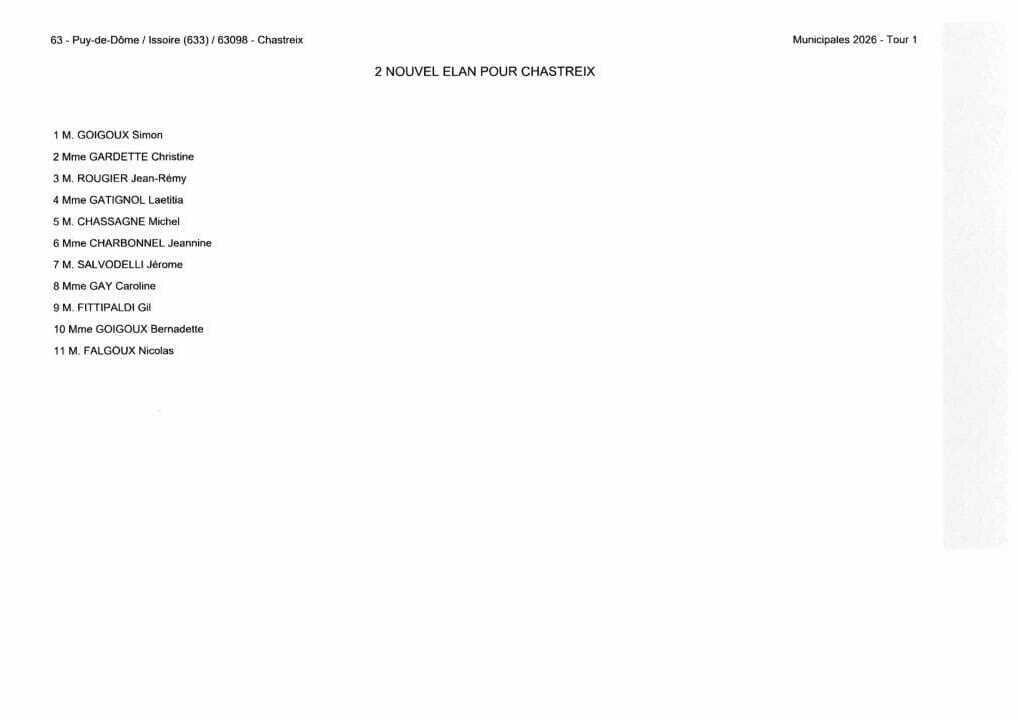 Les deux listes des candidats aux élections municipales 2026 de Chastreix sont les suivantes: