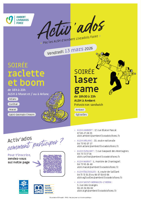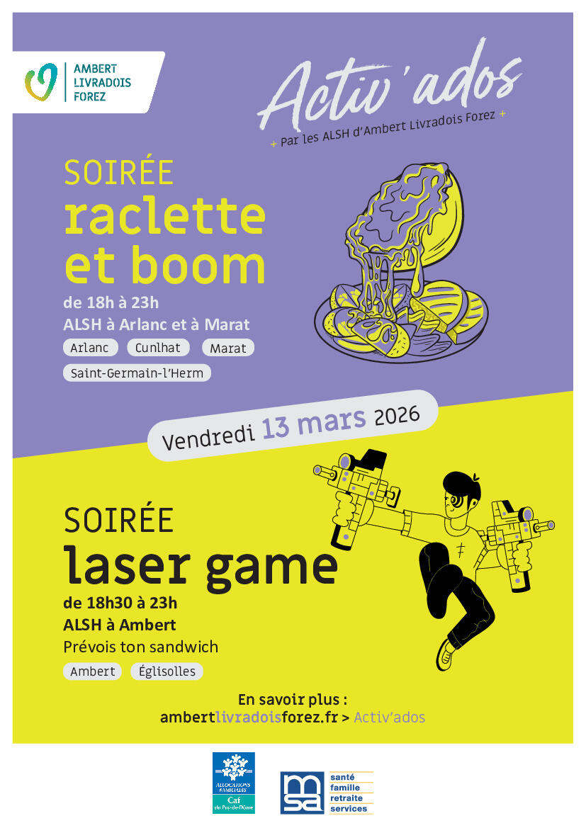 Vendredi 13 mars, les ALSH d'Ambert Livradois Forez proposent deux soirées pour vos ados.