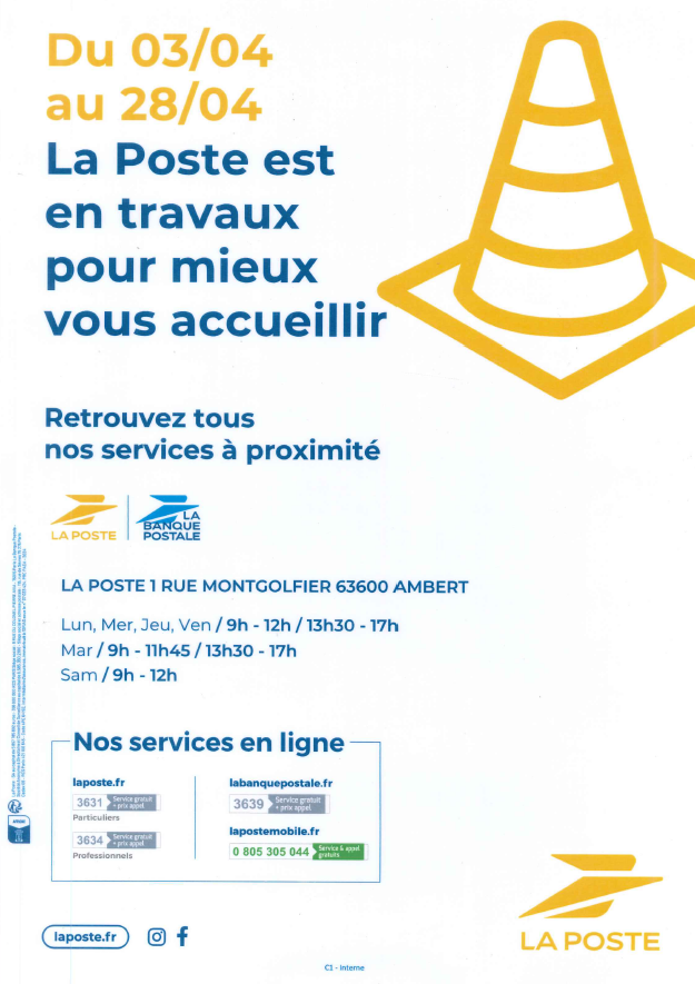 En attendant la réouverture, la Poste vous redirige vers le bureau d'Ambert dont voici les horaires d'ouverture :