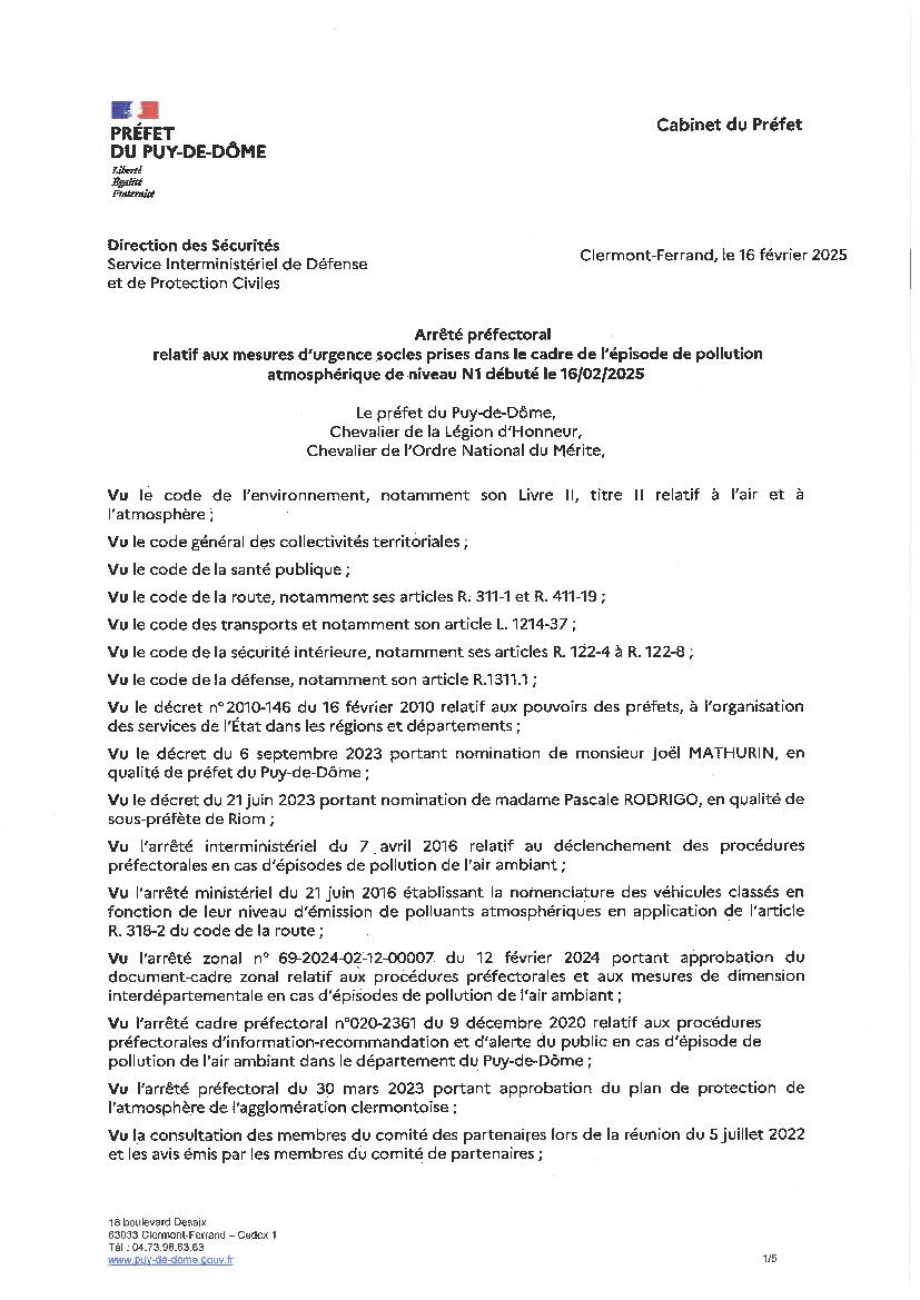 La procédure d'alerte de niveau 1 (équivalence vigilance orange) concernant la pollution atmosphérique a été activée par la Préfecture du Puy de Dôme à partir du lundi 17 février 2025, 00h00, jusqu'à la diffusion du message de levée d'alerte. Il s'agit d'un épisode de pollution de combustion.