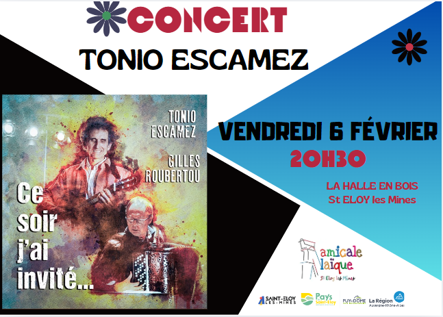 L'Amicale Laïque vous invite à un concert de Tonio Escamez le vendredi 6 février à 20h30, à La Halle en Bois de St Eloy les Mines.