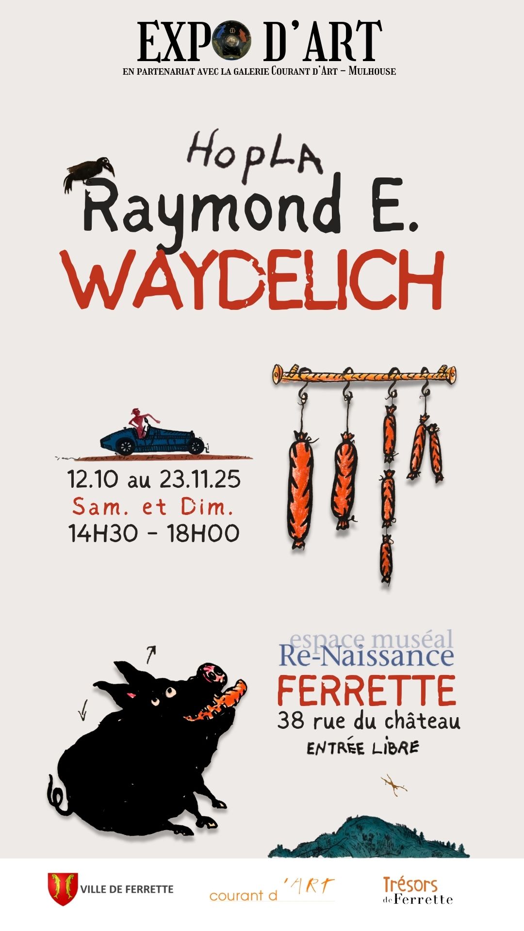 🖼️ L’exposition “Hopla, Raymond E. Waydelich” illustre toute la fantaisie, l’humour et la profondeur de son œuvre. Elle est organisée par l’association Trésors de Ferrette, en partenariat avec la galerie Courant d’Art (Mulhouse), avec le soutien de Rosita Waydelich, veuve de l’artiste, et de Francis Waydelich, son frère.