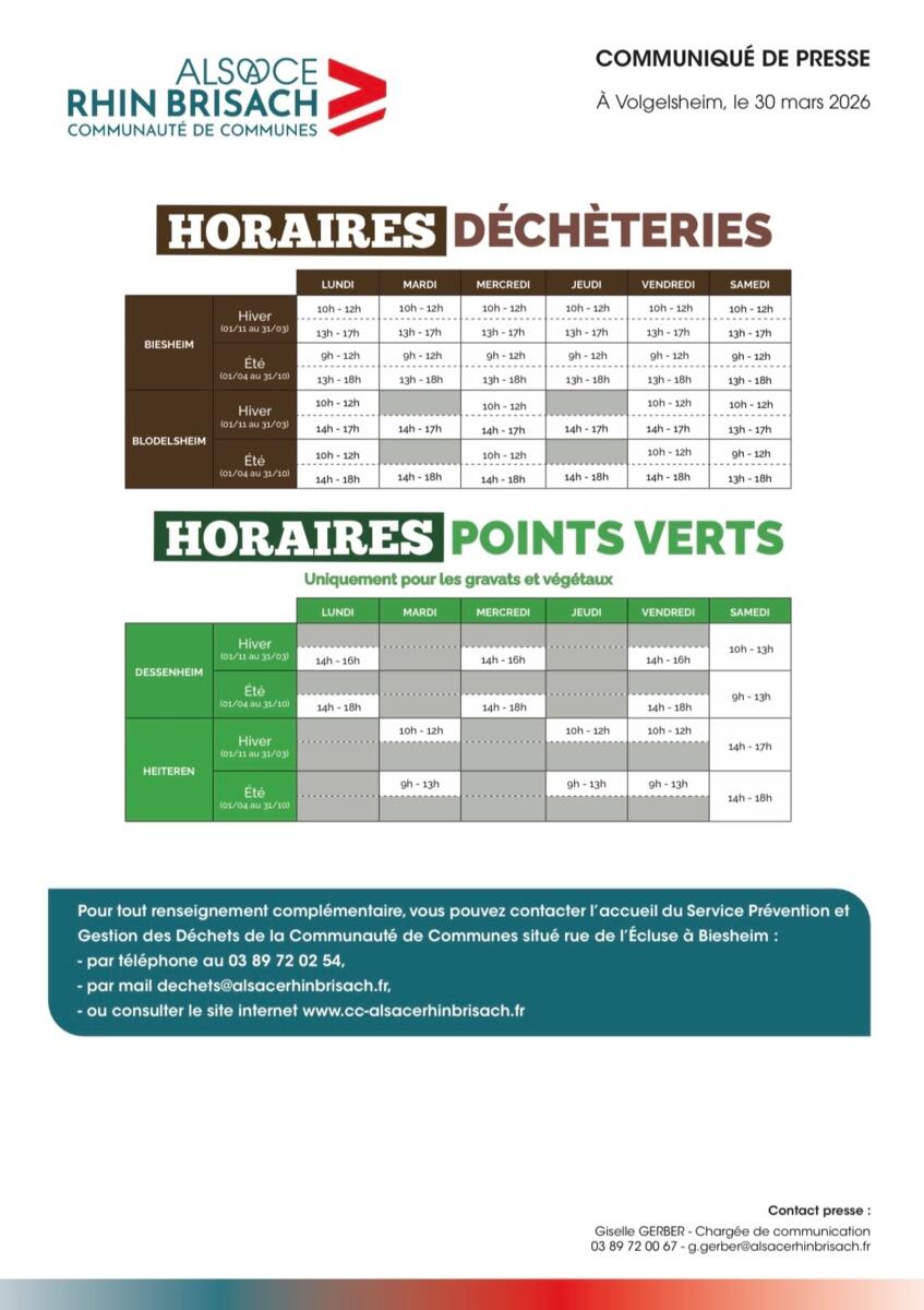 ♻️ La Communauté de Communes Alsace Rhin Brisach vous informe que les déchèteries et points verts passent à l’heure d’été ⏰ ♻️