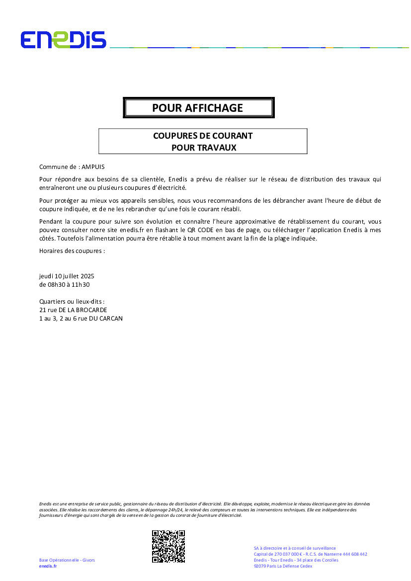 Pendant la coupure pour suivre son évolution et connaître l’heure approximative de rétablissement du courant, vous pouvez consulter notre site enedis.fr en flashant le QR CODE en bas de page, ou télécharger l’application Enedis à mes côtés. Toutefois l’alimentation pourra être rétablie à tout moment avant la fin de la plage indiquée.