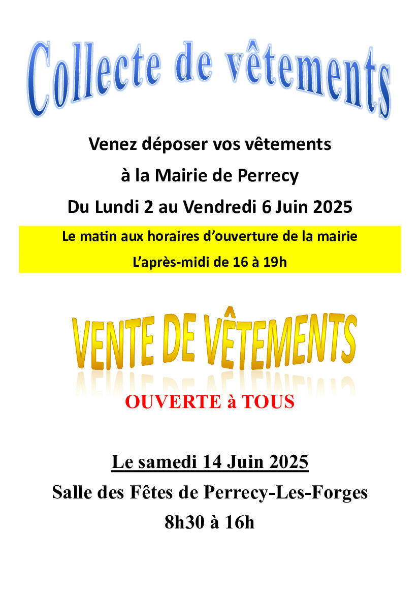 Le Centre Communal d’Action Sociale de Perrecy-les-Forges organisera une collecte de vêtements (bébés, enfants, adultes), de linge de maison, de chaussures, jouets, articles de puériculture, etc…du lundi 2 au vendredi 6 Juin 2025.