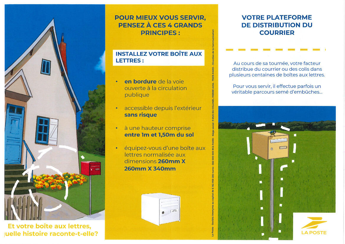 La Délégation Régionale Pays de la Loire de LA POSTE informe les habitants de la commune de la nécessité de la mise en conformité des boîtes aux lettres privées évitant ainsi les boîtes inaccessibles, les accès dangereux pour les facteurs les accès sur les voies privées...