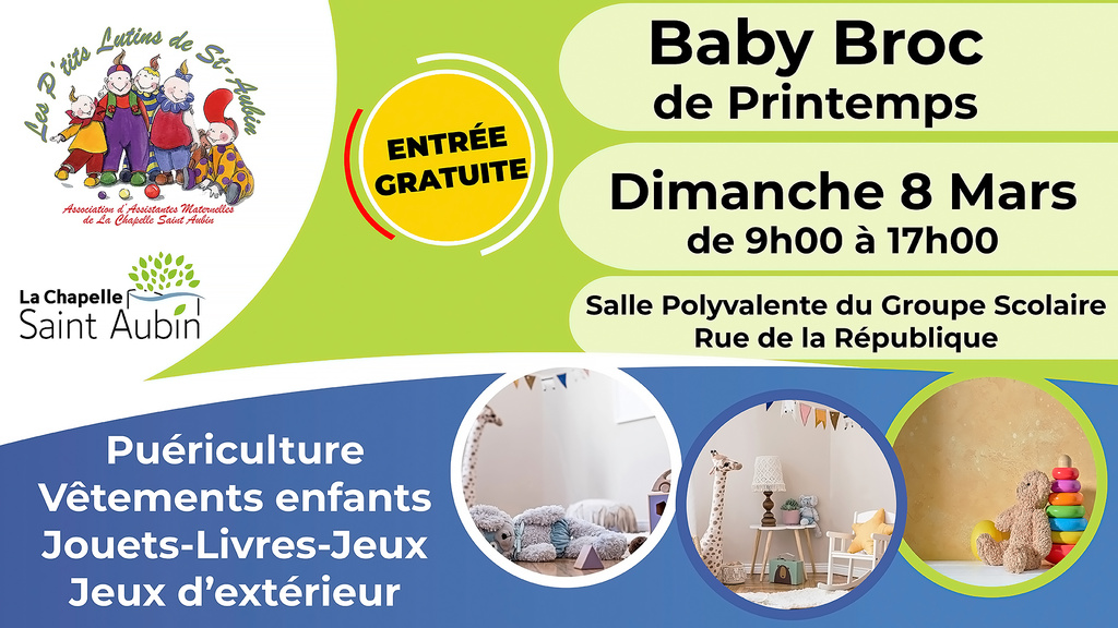 L'association des P'tits Lutins de Saint Aubin vous invite à son ″Baby Broc de Printemps″ (vêtements enfants, jouets, livres, jeux et jeux d’extérieur) à la Salle Polyvalente du Groupe Scolaire Pierre Coutelle, rue de la République.