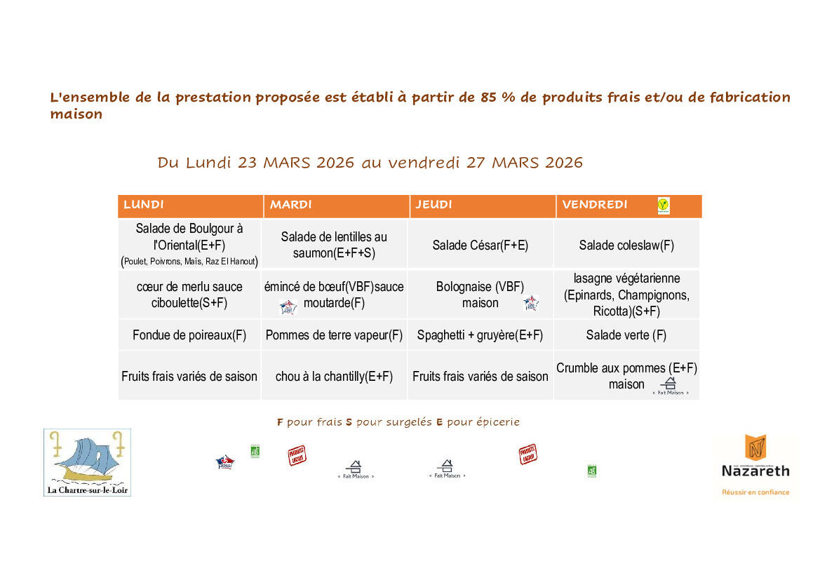 Veuillez trouver ci-joint les menus de la cantine pour la semaine du lundi 23 mars au vendredi 27 mars 2026.