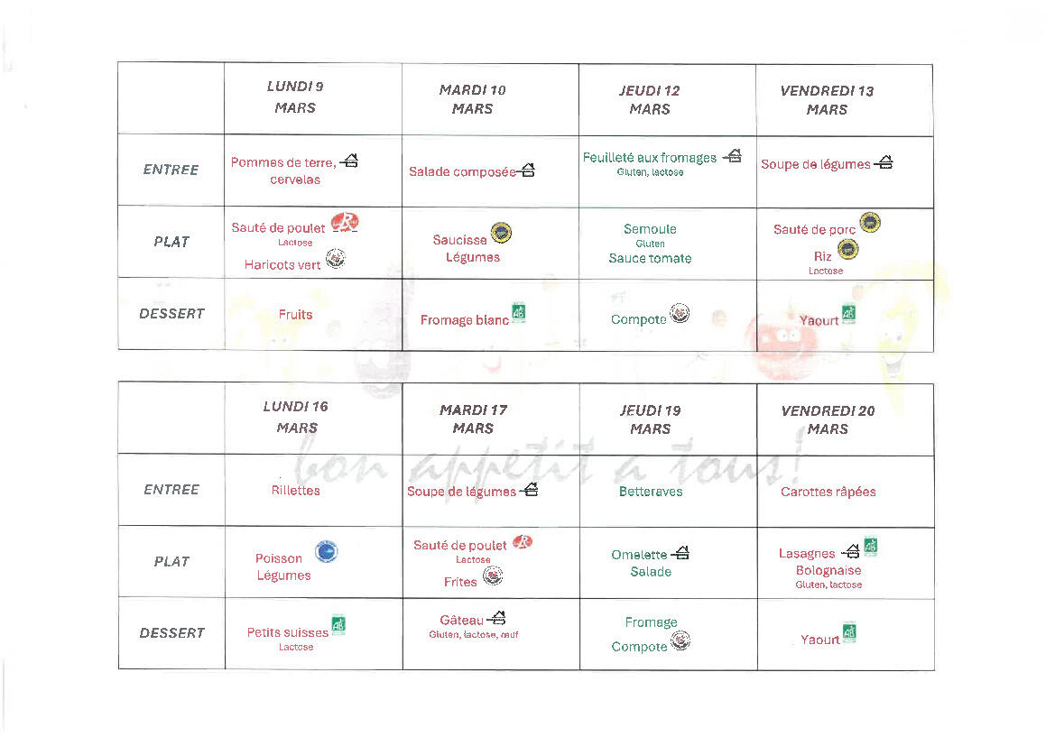 Menus cantine mars