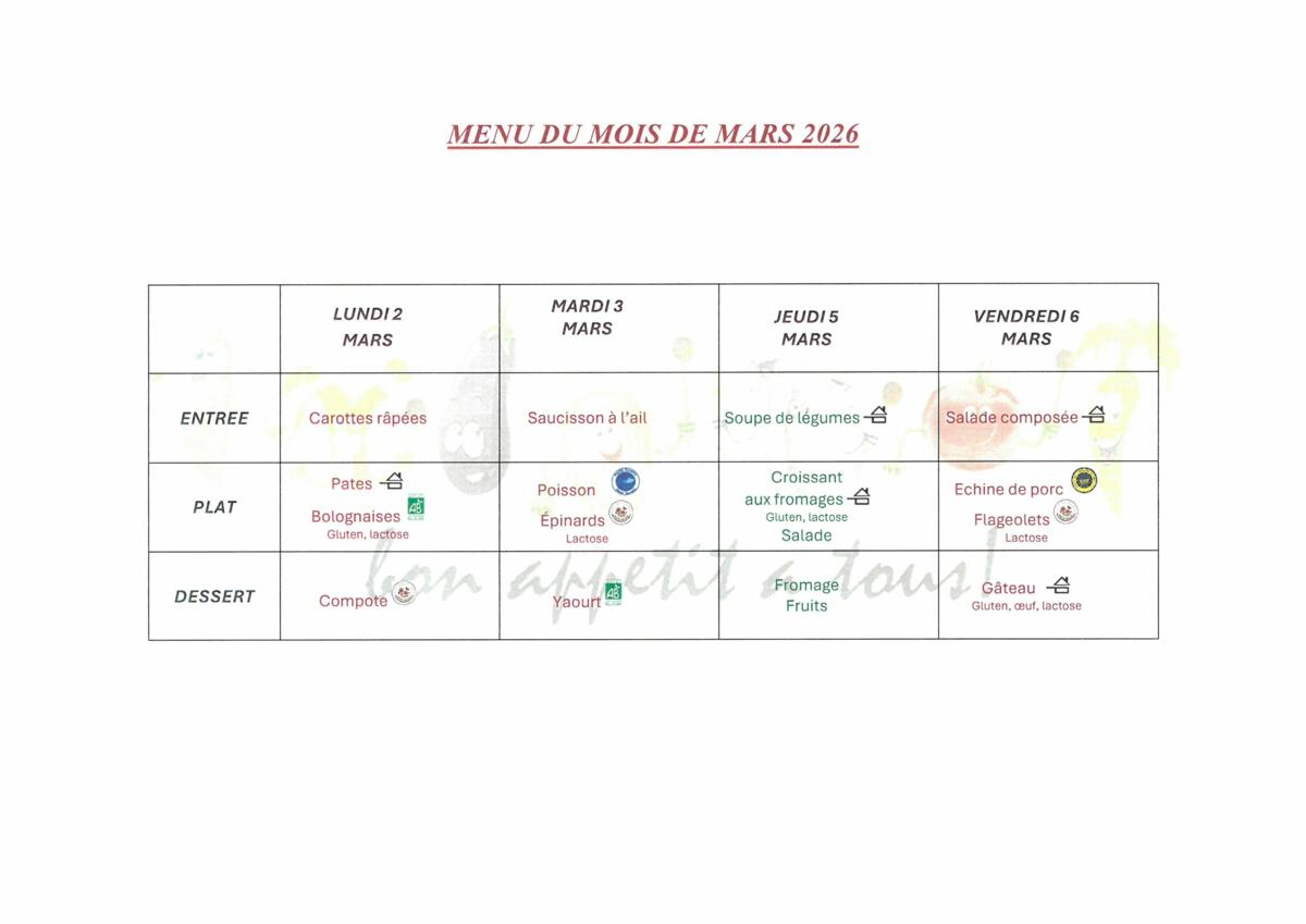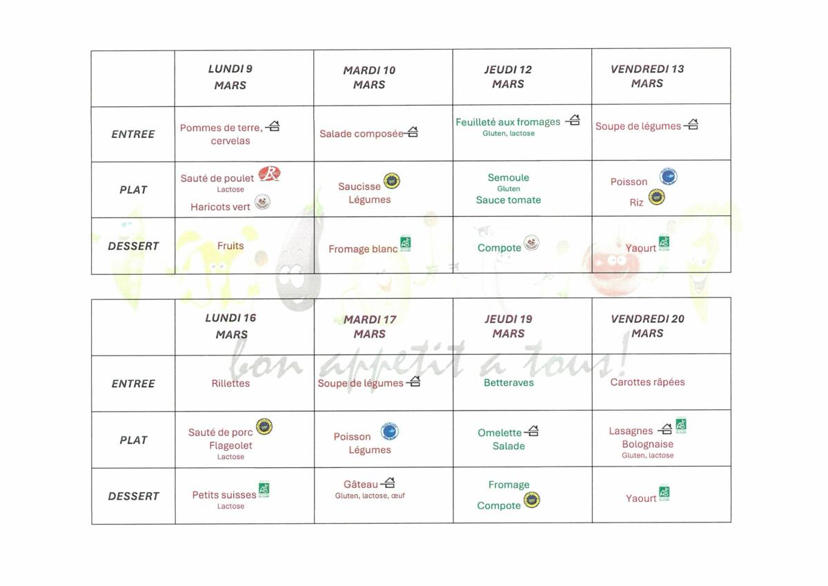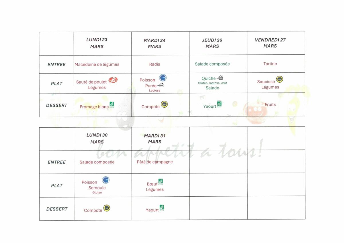 Menus cantine mars