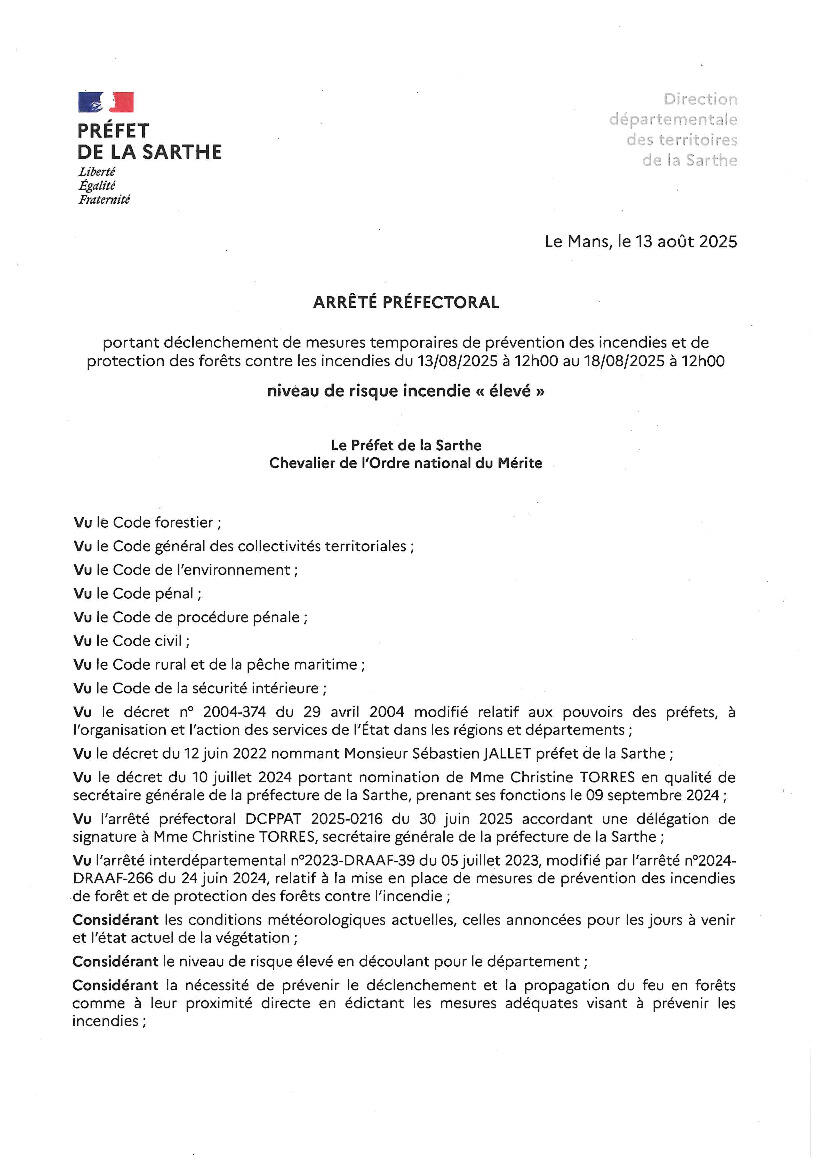 Arrêté Préfectoral - risque Incendie du 13/08 au 18/08