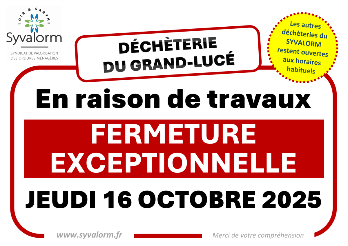 🏗 En raison de travaux, nous vous informons de la fermeture exceptionnelle de la déchèterie du GRAND-LUCÉ