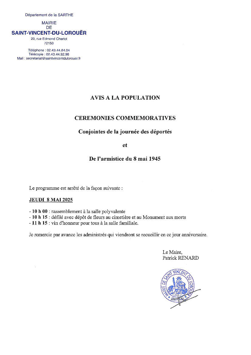 COMMEMORATION DU 8 MAI 1945 25-04-19 Cérémonies Commémoratives de l'armistice de 1945 le Jeudi 8 Mai 2025 à partir de 10h. Source : Mairie de Saint-Vincent-du-Lorouër