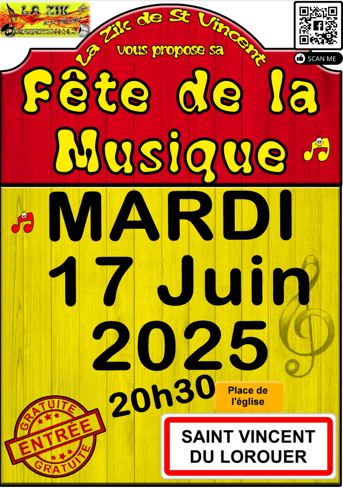 🎷🎵🎺Fête de la musique par la ZIK de St Vincent le Mardi 17 juin à partir de 20h30 Place de l'église. Restauration possible sur place à partir de 20h proposée par Patrick REZÉ, le restaurateur.🎶🎷
