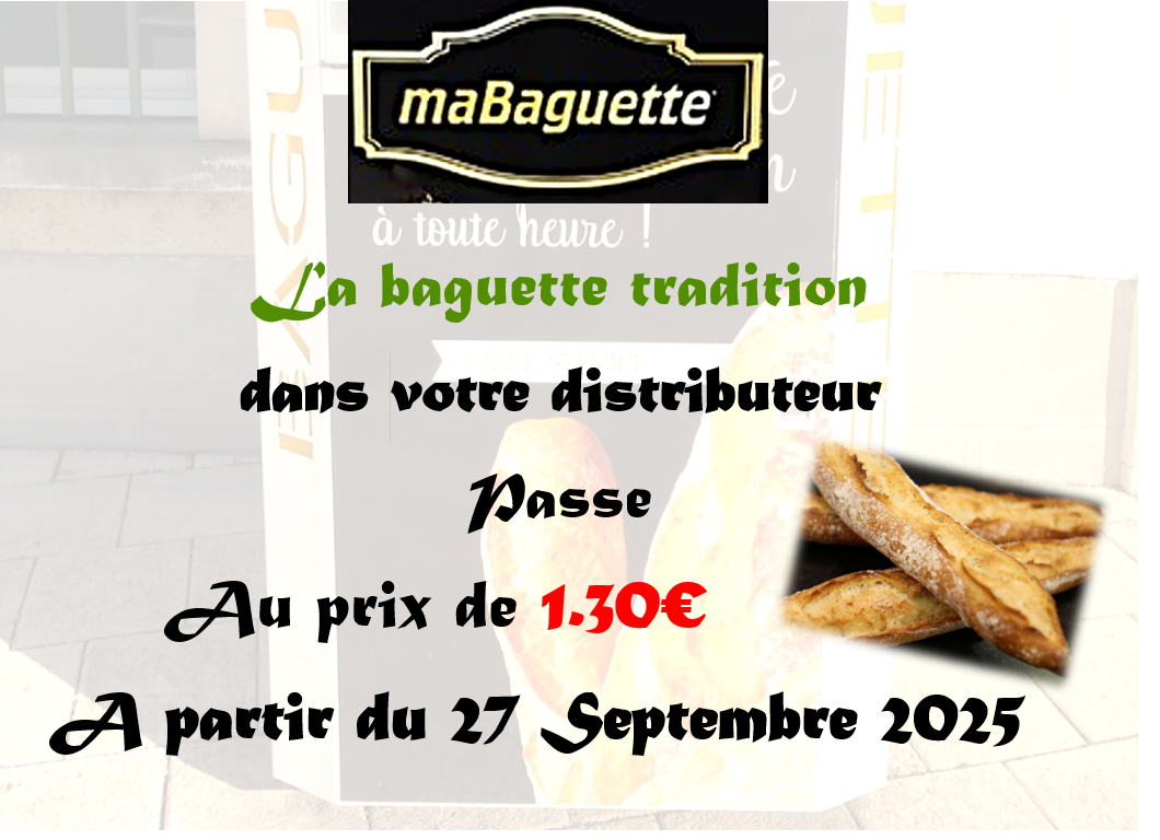 🥖🥖 Votre baguette tradition, passe au prix de 1,30€ à partir du samedi 27 septembre 2025