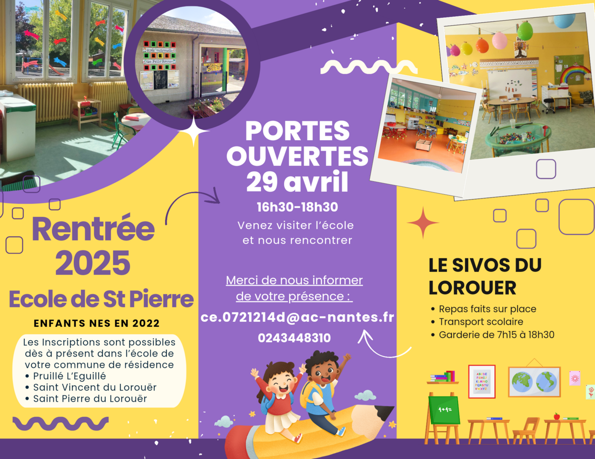 📍 Le Mardi 29 avril auront lieu les portes ouvertes de l'école maternelle de St Pierre du Lorouër 🤩 pour la rentrée 2025 des enfants nés en 2022.