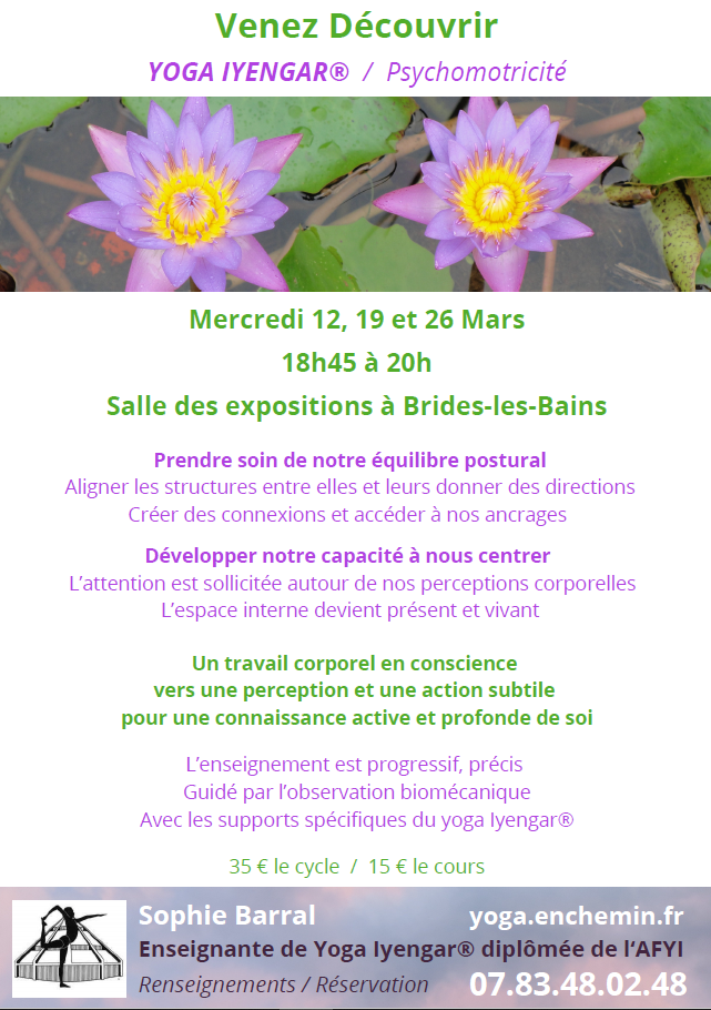 YOGA IYENGAR - Psychomotricité 25-03-12 Mercredi 12, 19 et 26 Mars de 18h45 à 20hSalle des expositions à Brides-les-Bains