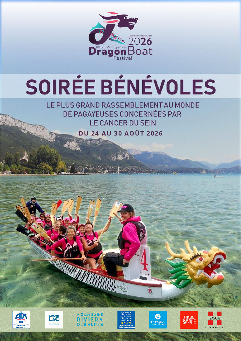 Le lundi 02 février 2026 à 19 h 00, au Centre des Congrès d'Aix-Les-Bains aura lieu une soirée d'information bénévoles pour le festival "Dragon Boat Ladies", qui se déroulera du 24 au 30 août 2026 sur le lac du Bourget.