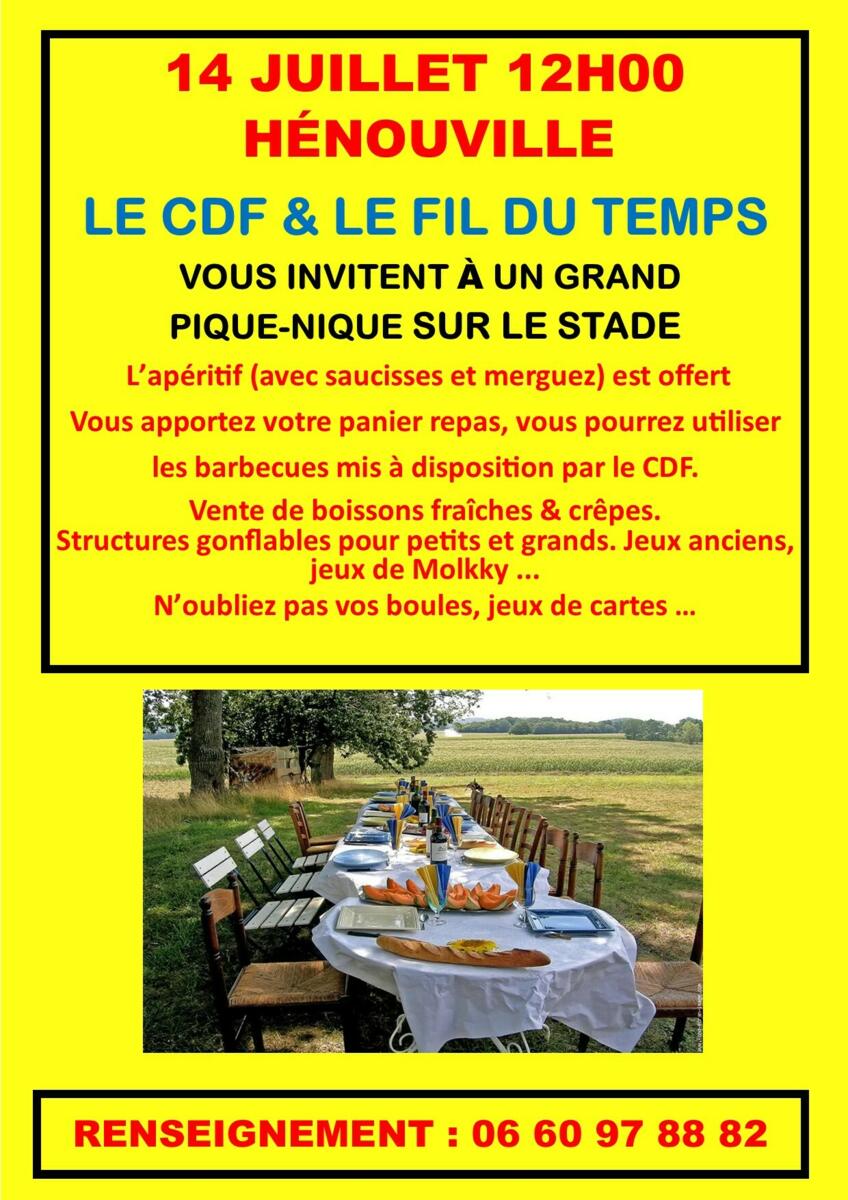 Le Comité des Fêtes et le club Au Fil du Temps vous invitent à venir passer un très bon moment le lundi 14 juillet pour le grand pique-nique sur le stade d'Hénouville.