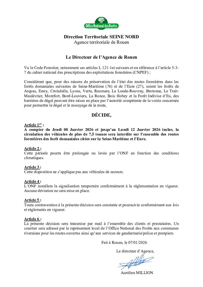 Comme l’ensemble des routes forestières ouvertes à la circulation en forêts domaniales dans les départements de la Seine Maritime et de l’Eure, il a été décidé par le directeur de l’agence de Rouen, de la mise en place d’une barrière de dégel pour protéger le voirie forestière dans le cadre d’un arrêté d’interdiction de circulation. Cet arrêté précise :