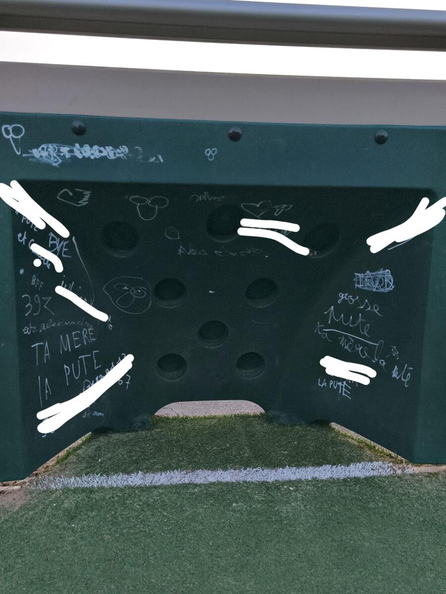 Cependant ce soir, au moment d'aller fermer, nous avons constaté de nombreux écrits dégradants sur l'enceinte même du city-stade. Des mots très offensants, des prénoms, des numéros de téléphone, des insultes, écrits au stylo feutre blanc... Nous avons aussi constaté la nécessité, pour certains, d'ouvrir un dictionnaire ou un Bescherelle 📚