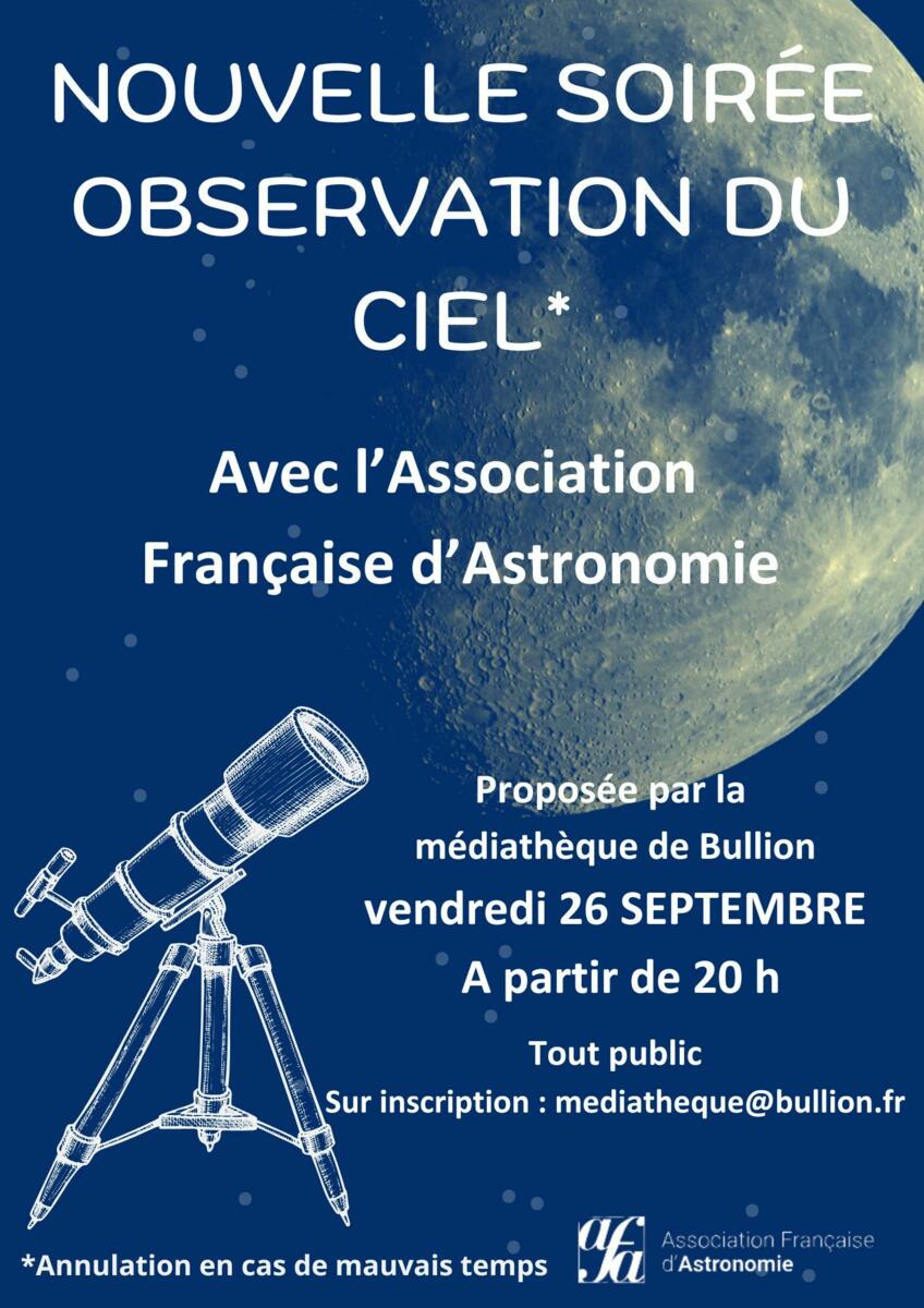 Pensez à vous inscrire (directement à la médiathèque ou par mail mediatheque@bullion.fr) pour la soirée observation du ciel avec l'Association Française d'astronomie le vendredi 26 septembre à 20h.
