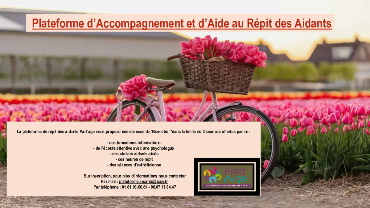 La plateforme de répit des aidants Part’age vous propose des séances de ‘Bien-être’ *dans la limite de 3 séances offertes par an : - des formations-informations - de l’écoute attentive avec une psychologue - des ateliers aidants-aidés - des heures de répit - des séances d’esthéticienne Sur inscription, pour plus d'informations, les contacter aux coordonnées ci-dessous :