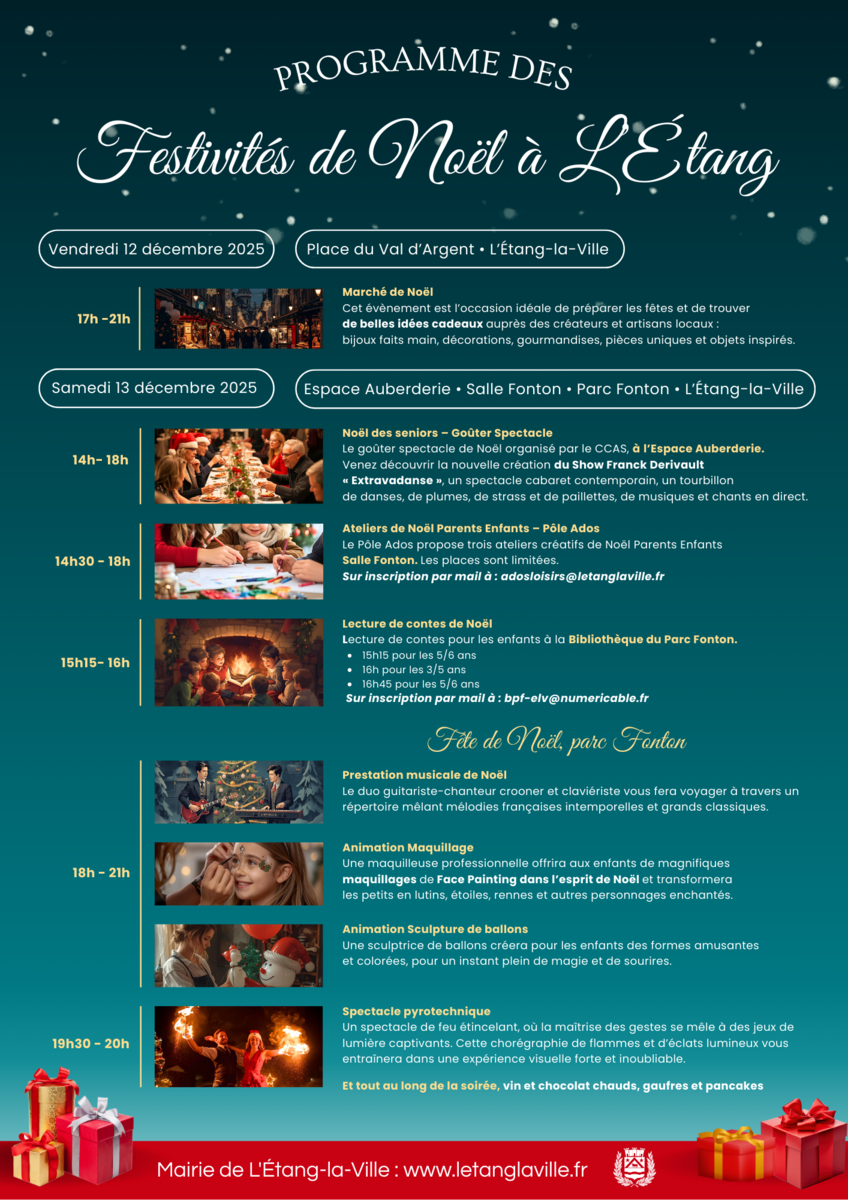 Vendredi 12 et samedi 13 décembre, la mairie et les associations sont heureuses de vous convier à plusieurs moments de partage pour célébrer ensemble la magie de Noël à L’Étang-la-Ville.