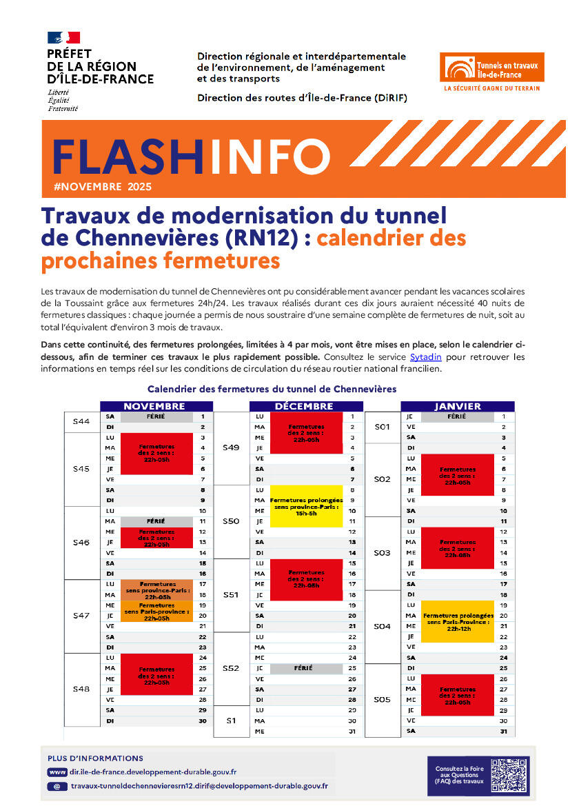 Actu tunnel de Chennevières : Calendrier de fermeture
