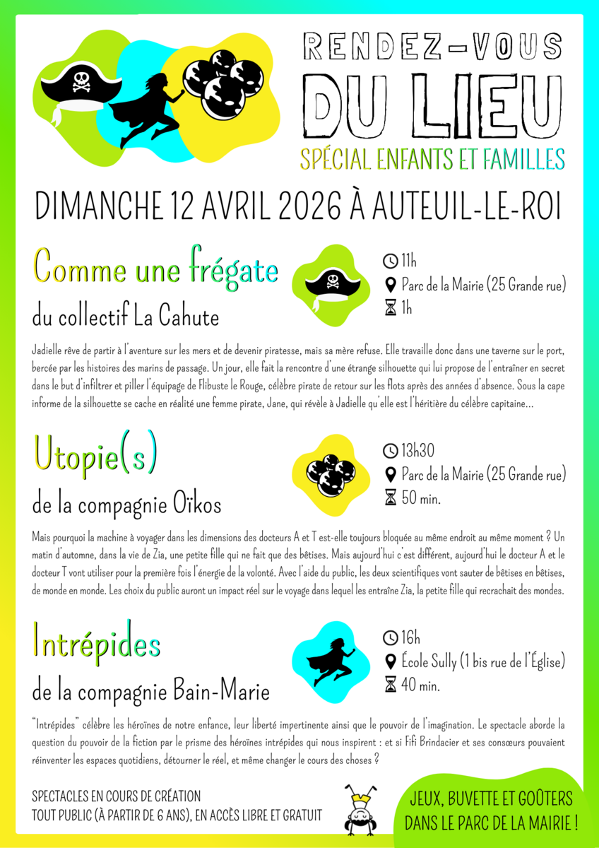 Le dimanche 12 avril 2026, Le Lieu propose un événement spécial enfants et familles, à Auteuil-le-Roi, avec plusieurs spectacles jeune public 😊.