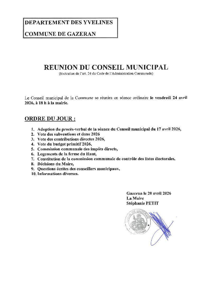 Réunion du Conseil municipal le vendredi 24 avril 2026 à 18h en salle du conseil.