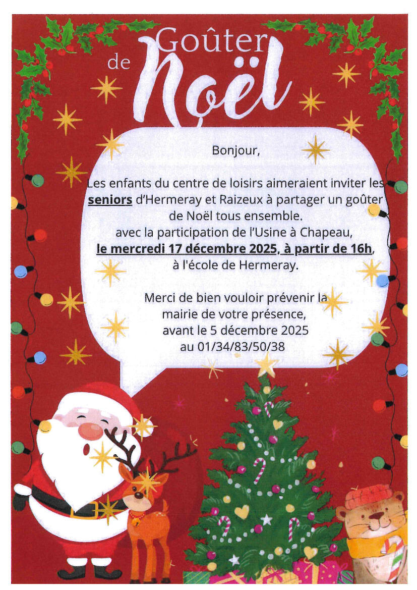 Les enfants du centre de loisirs aimeraient inviter les séniors d'Hermeray et de Raizeux à partager un goûter de Noël tous ensemble avec la participation de l'Usine à Chapeau, le mercredi 17 décembre 2025, à partir de 16h, à l'école d'Hermeray.