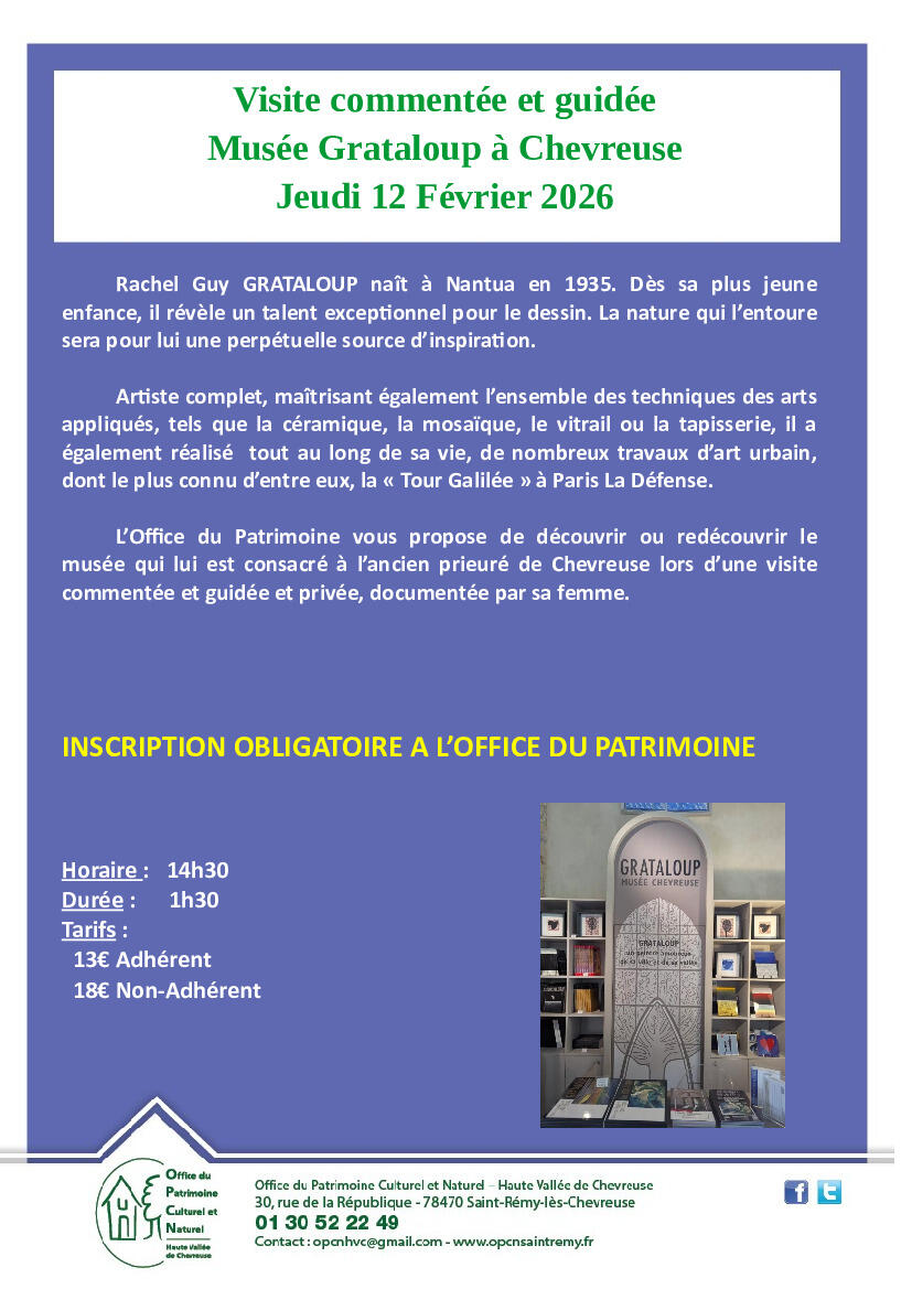 L'Office du Patrimoine de Saint-Rémy-lès-Chevreuse vous propose deux visites commentées et guidées du musée Grataloup de Chevreuse le jeudi 12 Février à 14h30 ainsi que l'alchimiste également à Chevreuse le vendredi 20 Février à 14h et la Pagode de Villebon-sur-Yvette le samedi 21 Mars à 11h.