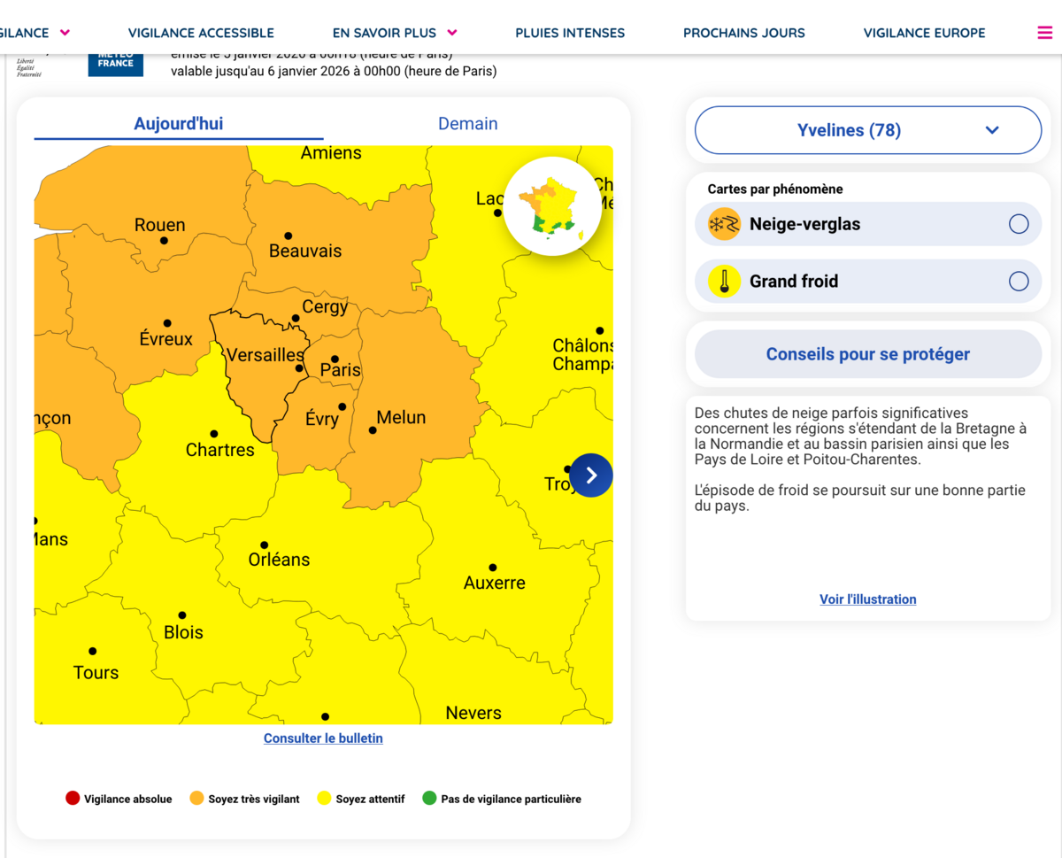 Message alerte Préfecture : vigilance ORANGE neige verglas pour la journée du mercredi 7 janvier 2026 26-01-06 Lire la suite