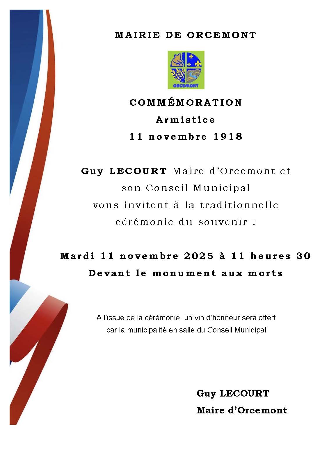 Guy Lecourt, Maire d'Orcemont et les membres du Conseil Municipal seraient honorés de votre présence à l’occasion de la commémoration de l’anniversaire de l’Armistice de 1918 le mardi 11 novembre 2025 à 11h30.