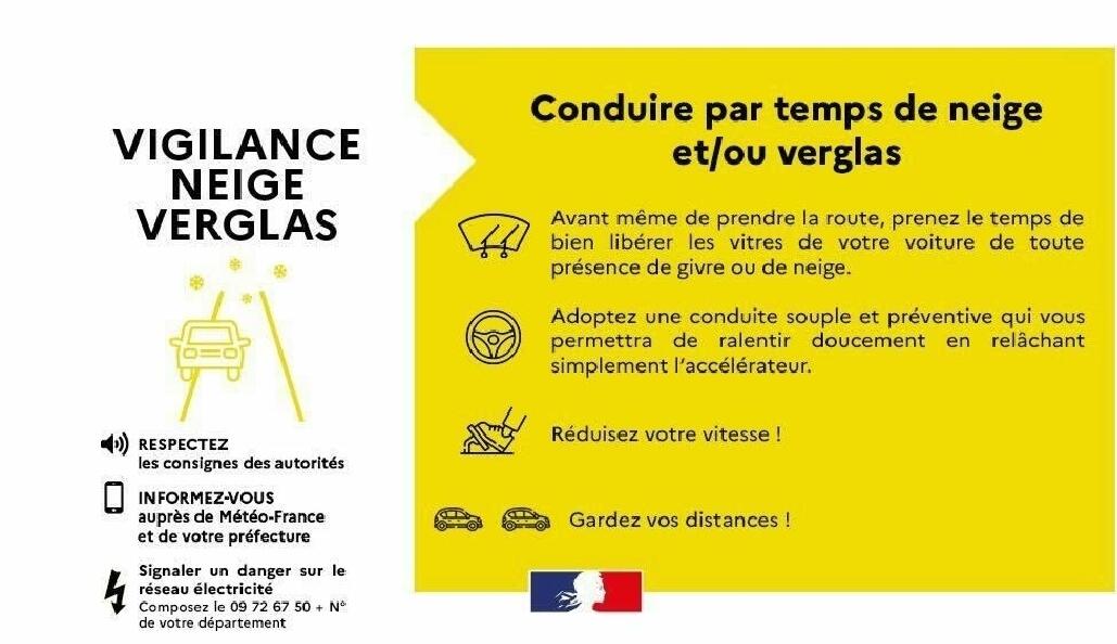 Nous vous invitons une fois de plus à être prudents lors de vos déplacements et à sensibiliser vos administrés s'ils sont amenés à utiliser leur véhicule. Il est conseillé de réduire la vitesse et d'augmenter les distances de sécurité.