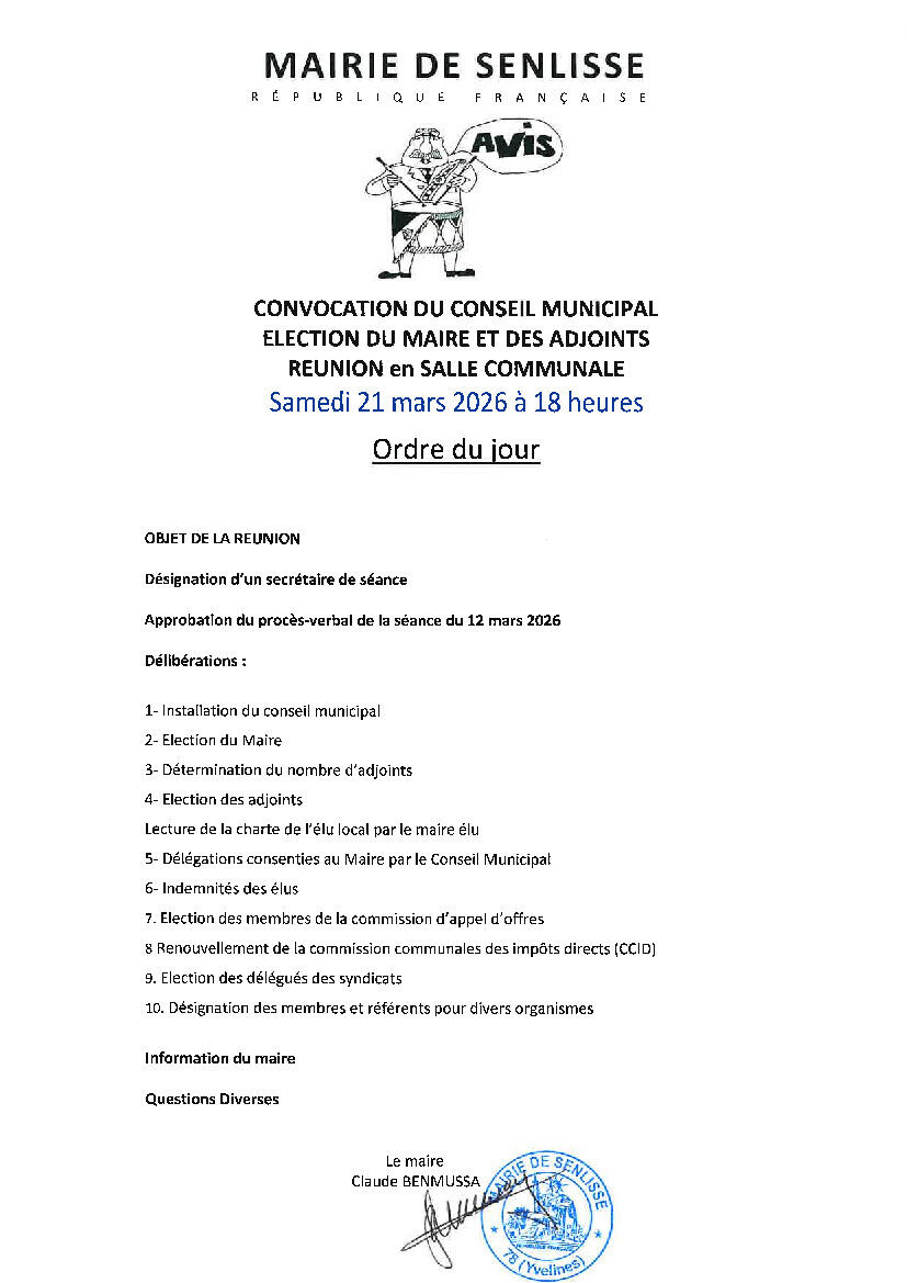 Conseil Municipal à 18H ce samedi 21 Mars 2026