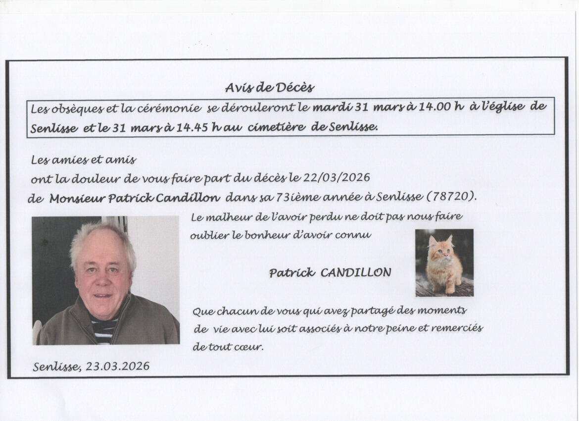 Obsèques de Monsieur Patrick Candillon mardi 31 mars 14H