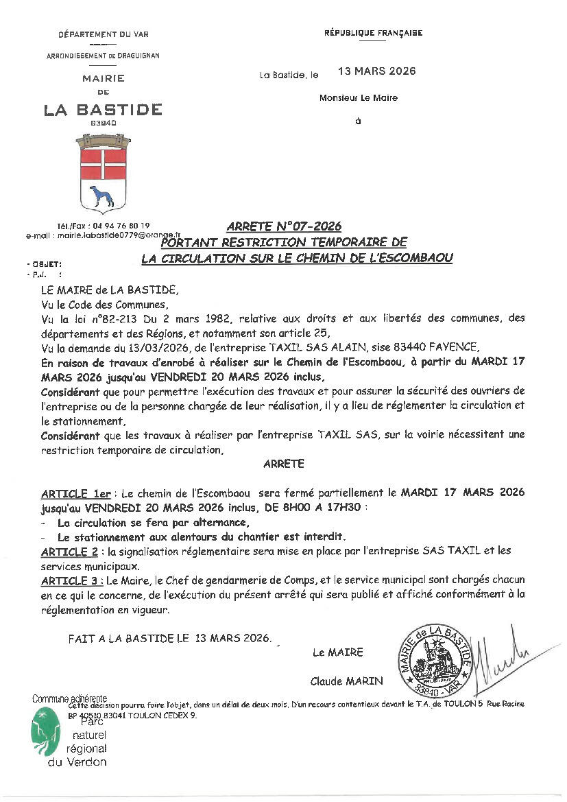 ARRETE RESTRICTION TEMPORAIRE CIRCULATION chemin Escombaou
