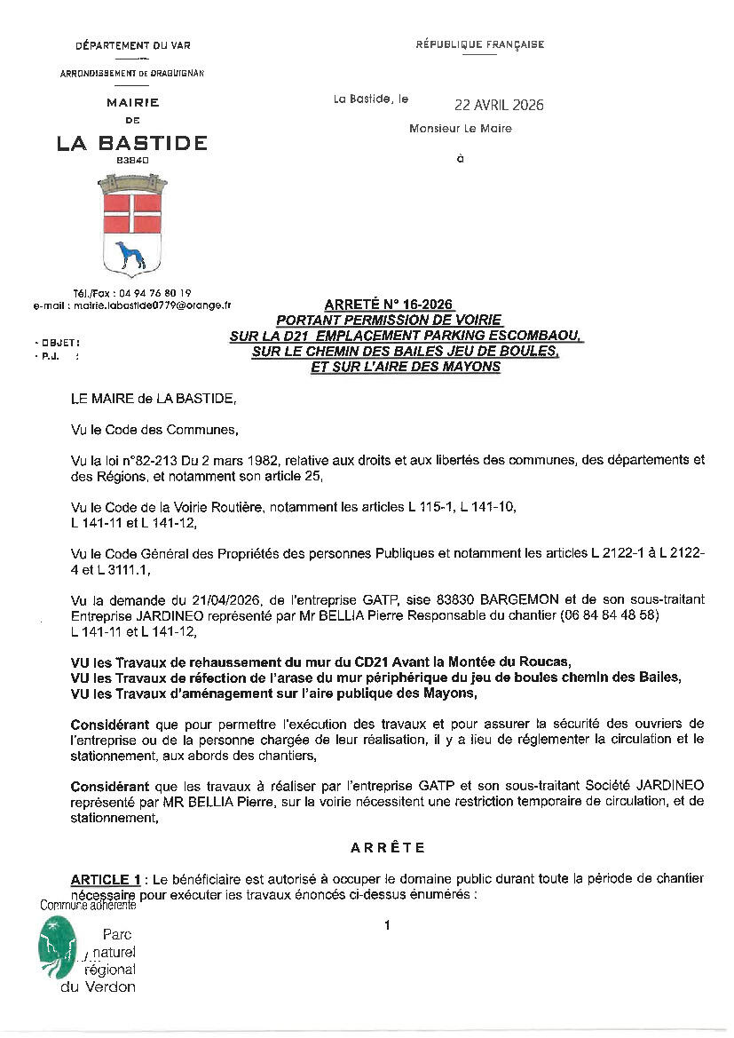 TRAVAUX SUR LE DOMAINE PUBLIC COMMUNAL LA BASTIDE