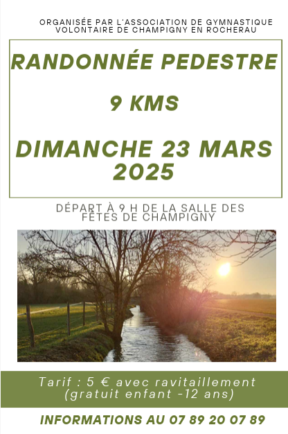 Pour la deuxième année la gym de Champigny en Rochereau, vous propose une randonnée avec pause gourmande dans notre jolie campagne, parlez - en autour de vous , départ le dimanche 23 mars à 9h pour 9km.