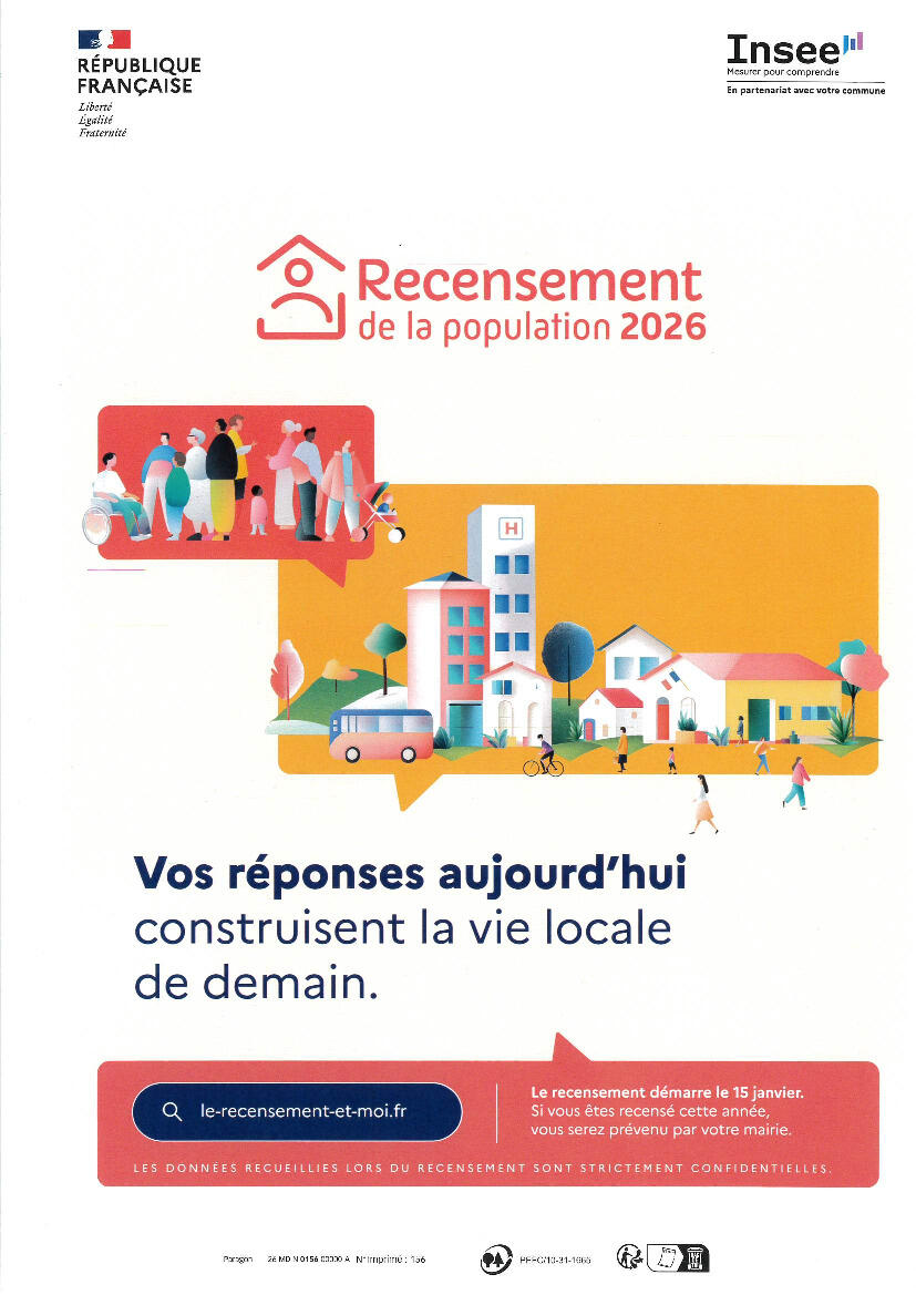 Du 15 janvier au 14 février 2026, la campagne de recensement de la population se déroule dans notre commune. Ce geste civique simple est essentiel pour le développement de nos services publics et l’avenir de notre territoire.