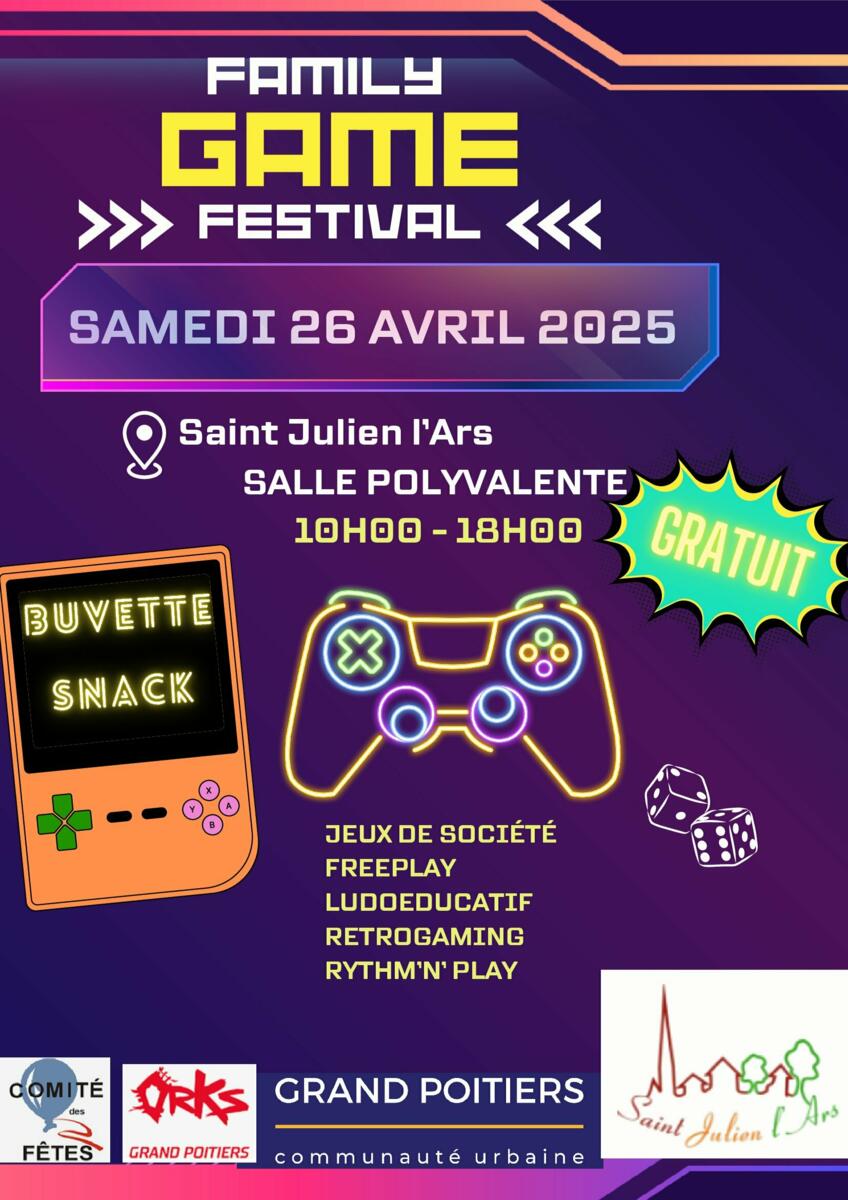 Le comité des Fêtes, la Mairie de Saint Julien l'Ars, Grand Poitiers et l'association multi gaming Orks organise pour vous, le Family Game Festival, un festival gratuit, ouvert à tous autour du jeu !