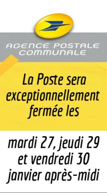 La Poste sera exceptionnellement fermée les mardi 27, jeudi 29 et vendredi 30 janvier après-midi.