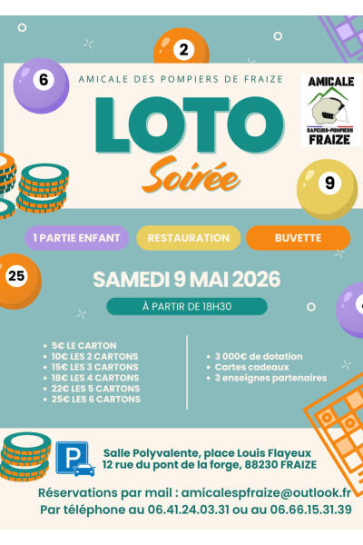 L’Amicale des Pompiers de Fraize organise une soirĂ©e loto le samedi 9 mai 2026 Ă partir de 18h30 Ă la Salle Polyvalente, place Louis Flayeux, 88230 Fraize.Â