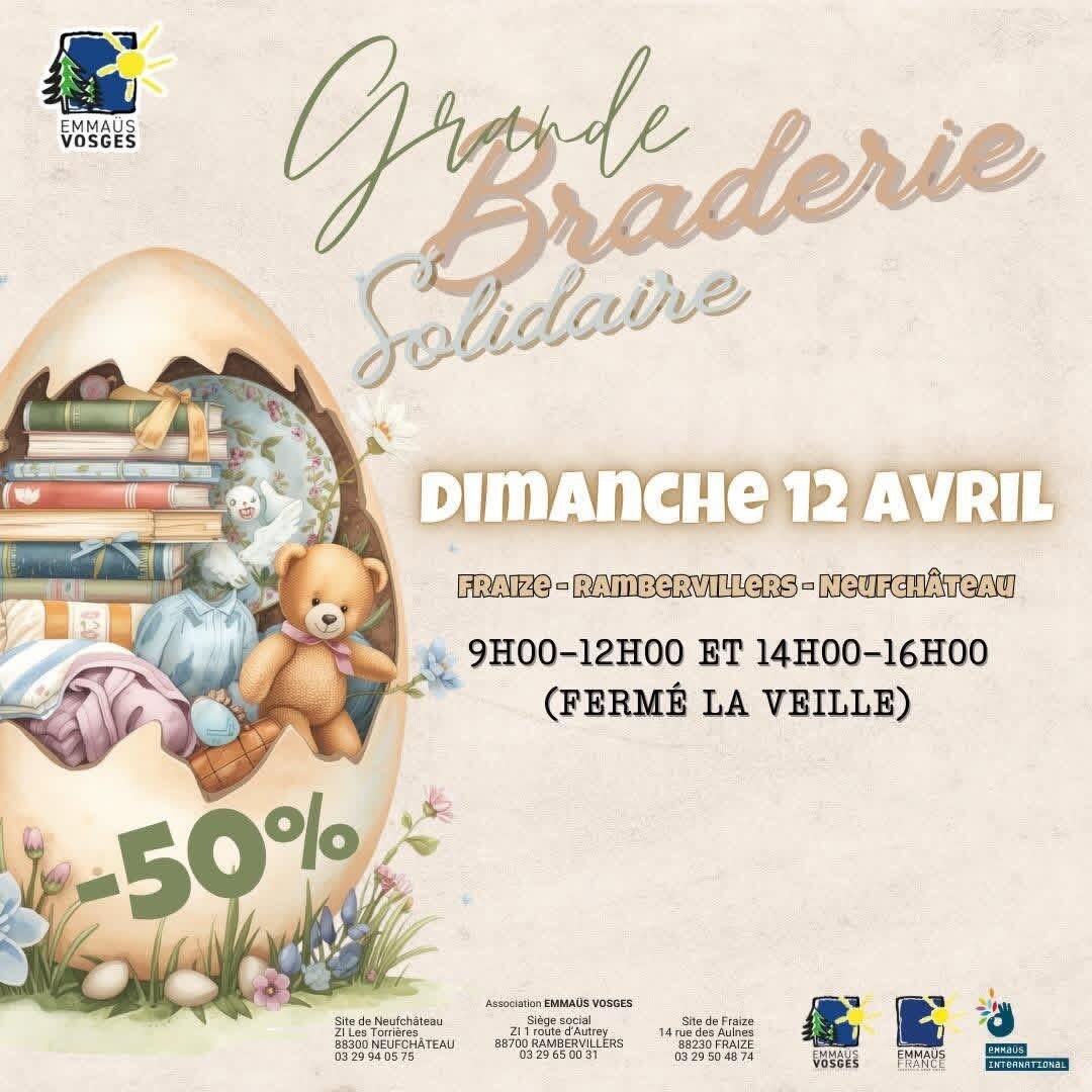 Venez à la grande braderie d’Emmaüs Vosges et profitez de -50% ! Jouets, vêtements, décorations… dénichez de vraies pépites à petits prix 🐣💛