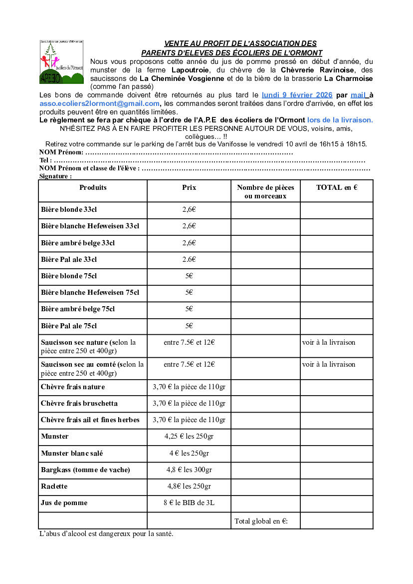 L'Association des Parents d'Eleves des Ecoliers de l'Ormont (APEEO) organise une vente de produits du terroir afin de soutenir et financer les projets éducatifs, les sorties scolaires et les activités pédagogiques pour les élèves du Regroupement Pédagogique Intercommunal de Nayemont-les-Fosses et Pair-et-Grandrupt.
